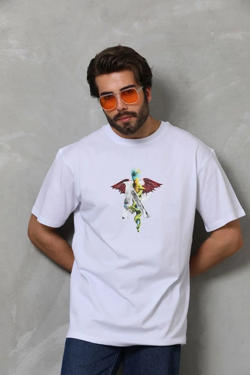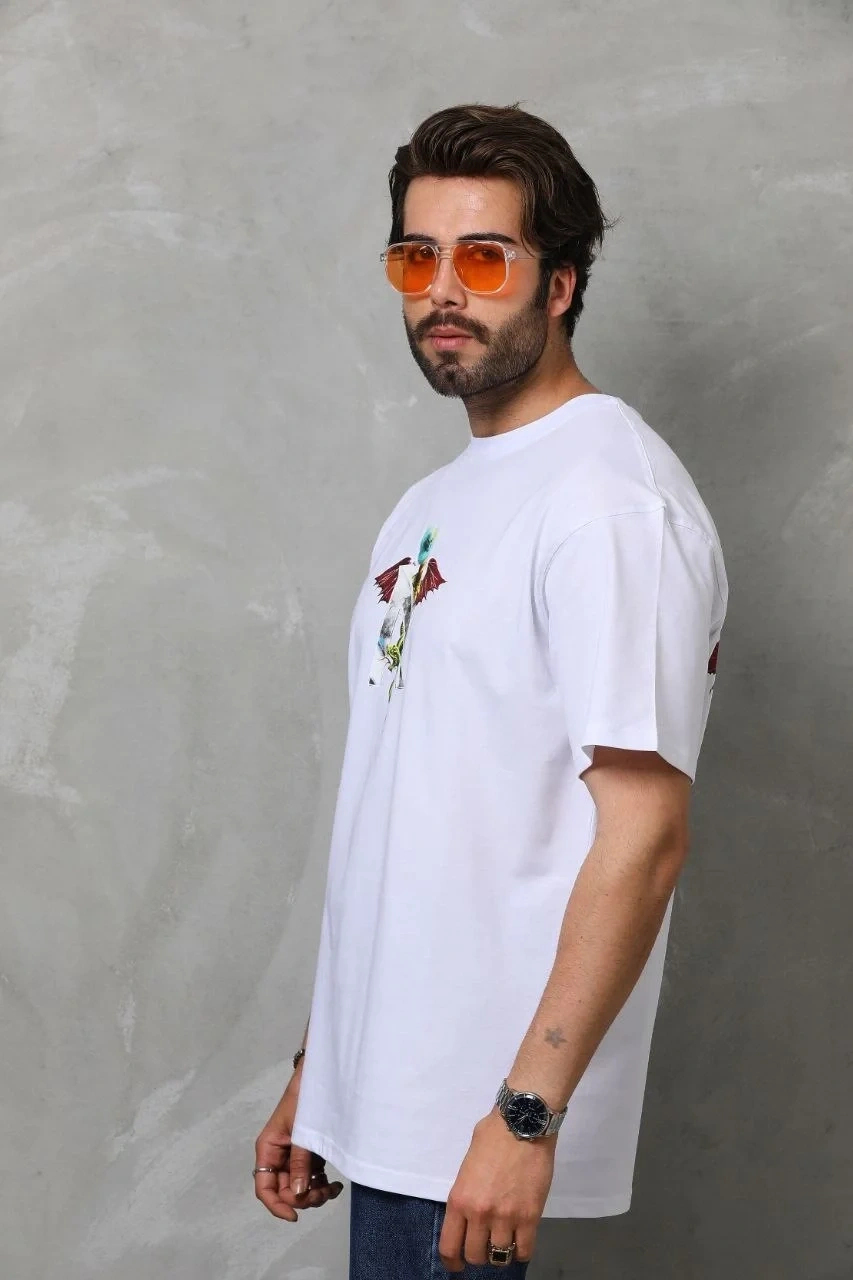 Erkek Baskılı T-Shirt Kısa Kol Bisiklet Yaka Regular Fit Rahat Kalıp Tişört - Beyaz