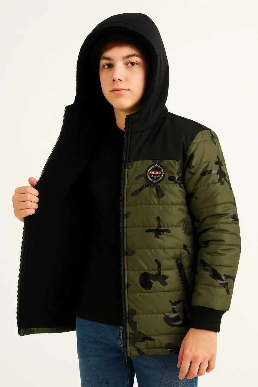 Erkek Çocuk Kamuflaj Desenli Mont İçi Sıcak Tutan Pelüş Astarlı, Kapüşonlu, Fermuarlı Kışlık Su İtici Şişme Mont - Lacivert