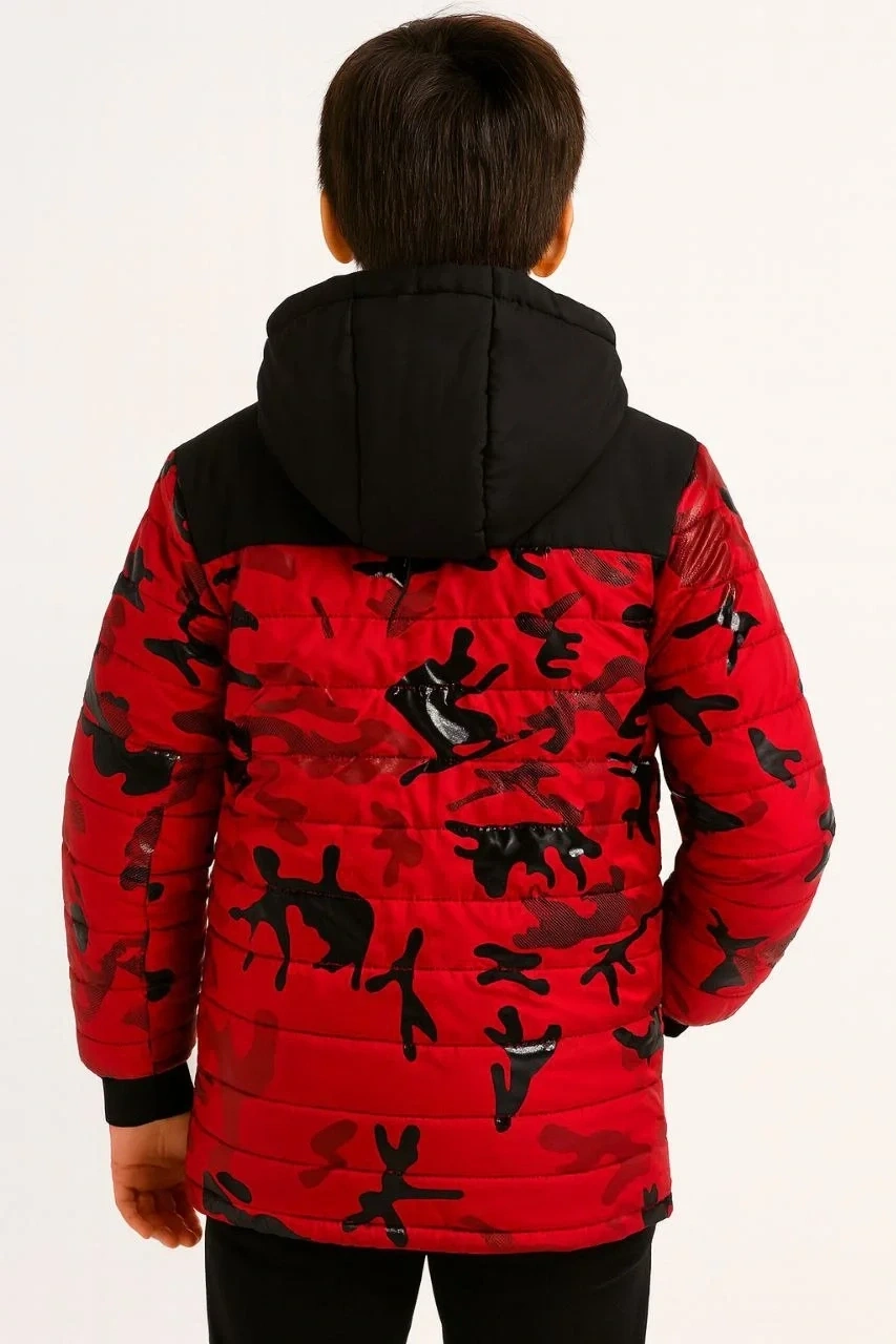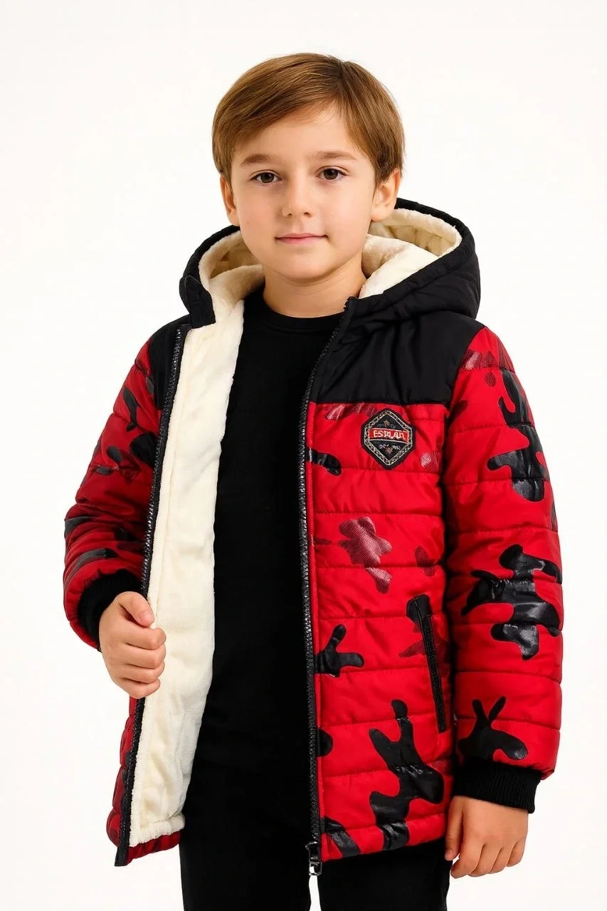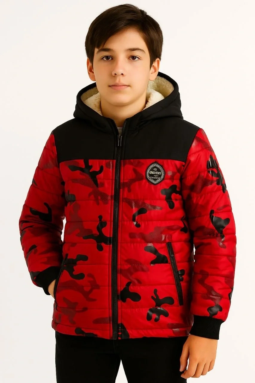 Erkek Çocuk Şişme Mont Hafif ve Sıcak Tutucu Kışlık Fermuarlı Su İtici Rahat Günlük Mont Kapüşonuz Modern Tasarım - Kırmızı