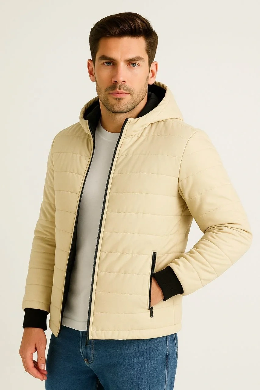 Erkek Şişme Kapüşonlu Fermuarlı Mont Su itici Kapitone Astarlı Kumaş Cepli Kışlık Rahat Kalıp - Krem