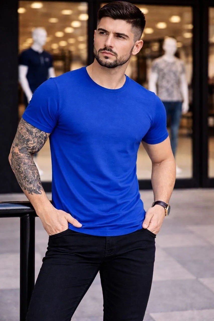 Erkek T-Shirt Bisiklet Yaka Slim Fit dar kesim Likralı Tişört Günlük Basic Body - Turkuvaz