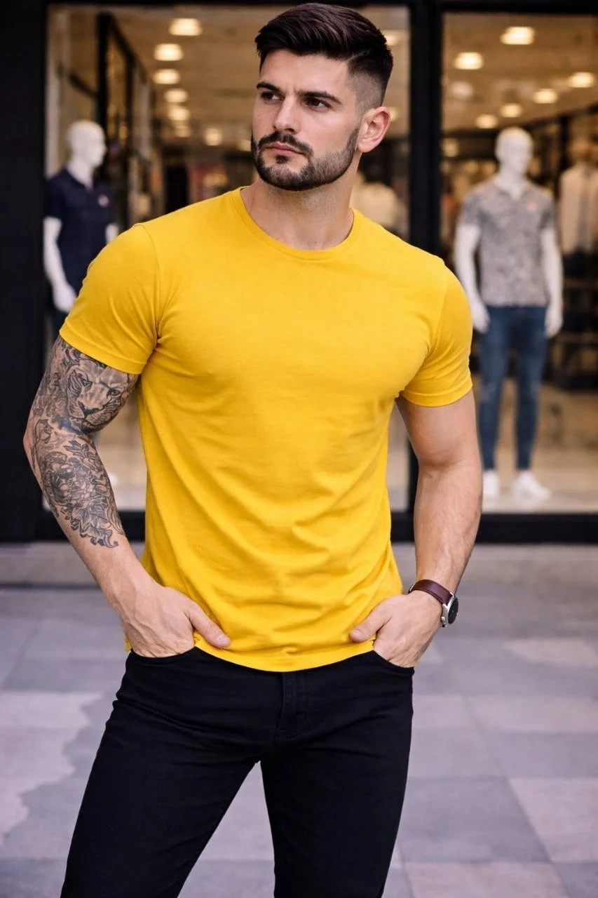 Erkek T-Shirt Bisiklet Yaka Slim Fit dar kesim Likralı Tişört Günlük Basic Body - Limon