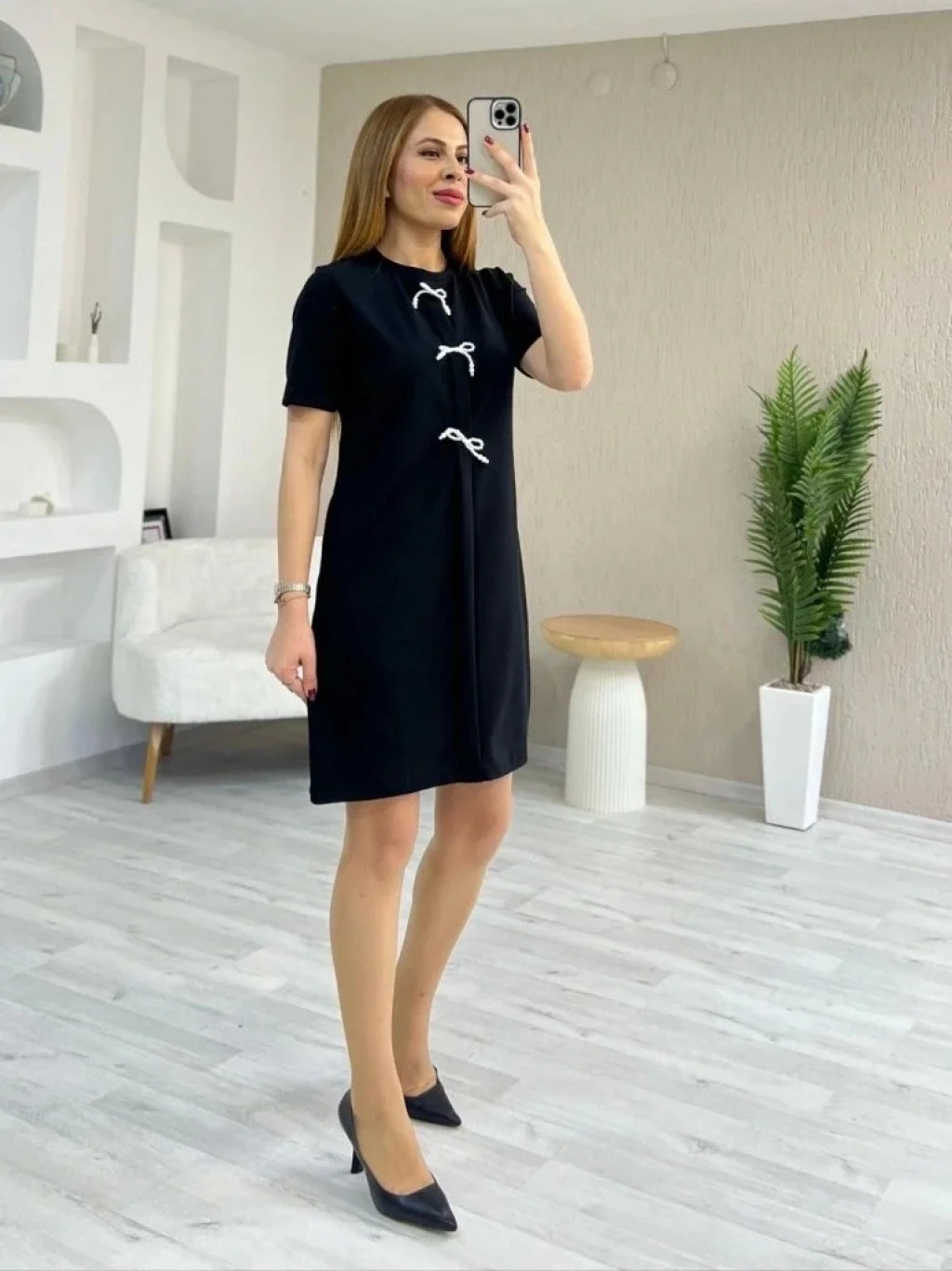 Kadın Kısa Kollu Bisiklet Yaka önden Fiyonk Detaylı Ithal Krep Elbise