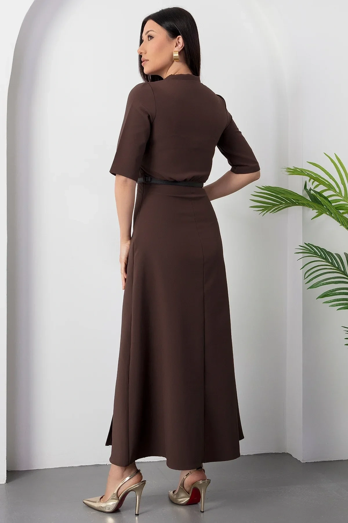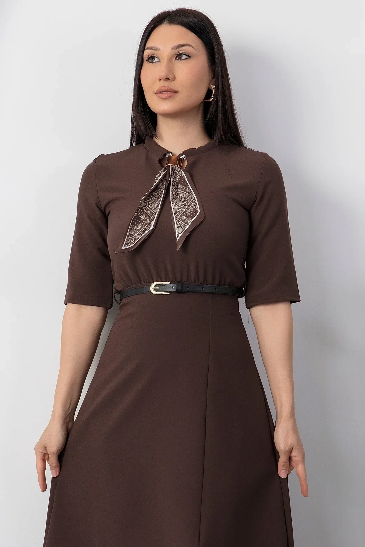 Kadın Kısa Kollu Fular Ve Kemer Detay önden Yırtmaçlı Maxi Boy Elbise