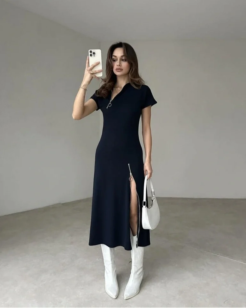 Kadın Kısa Kollu Yakadan Ve Etekten Fermuarlı Midi Viskon Iki Iplik Elbise