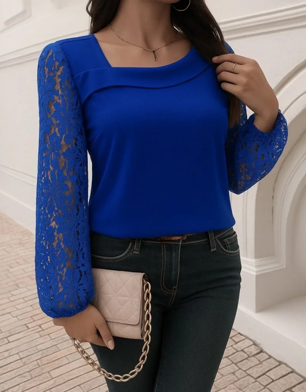 Kadın Uzun Kollu Asimetrik Yakalı Dantelli Ithal Krep Bluz