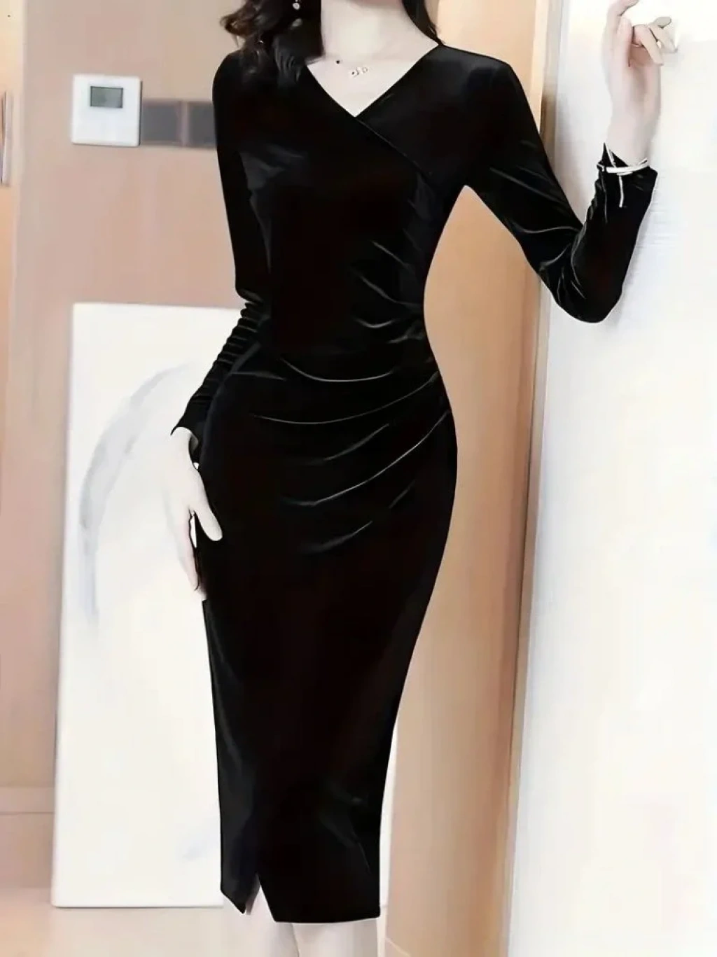 Kadın Uzun Kollu Kruvaze Yakalı Yandan Büzgülü önden çapraz Detaylı Midi Kadife Elbise