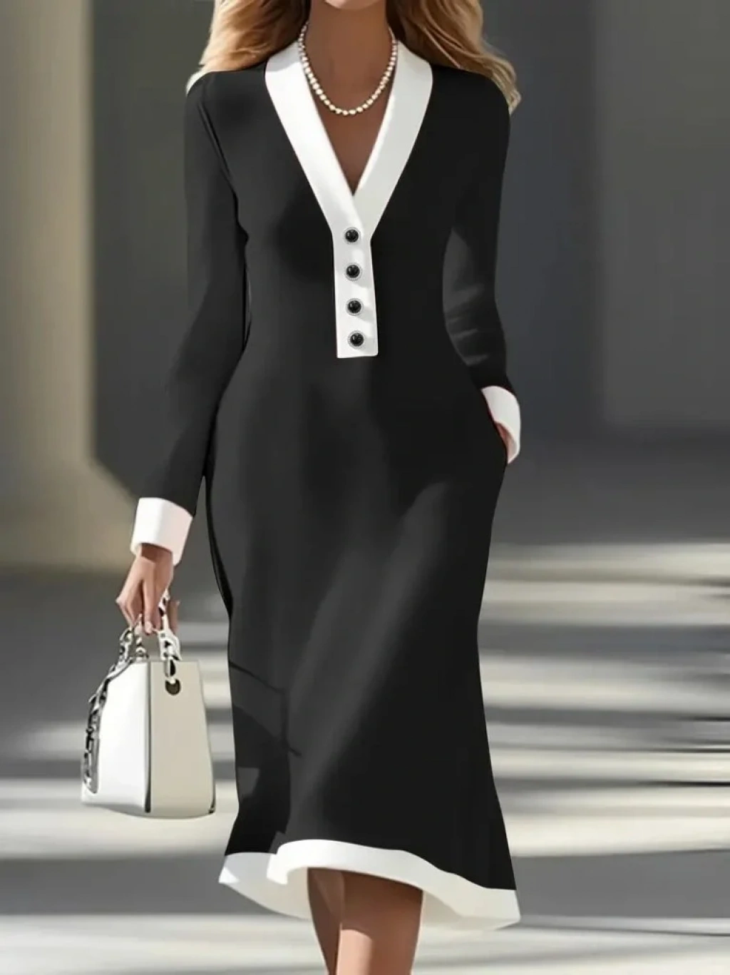 Kadın Uzun Kollu V Yakalı Düğmeli Midi Modal Elbise