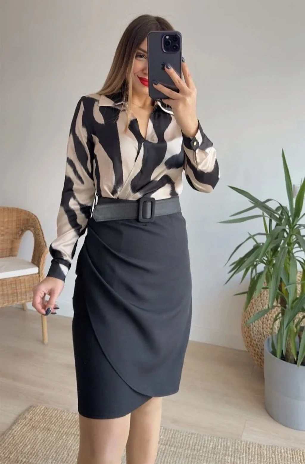 Kadın Uzun Kollu Yakalı üst Dalgıç Eteği Krep Kemerli Elbise