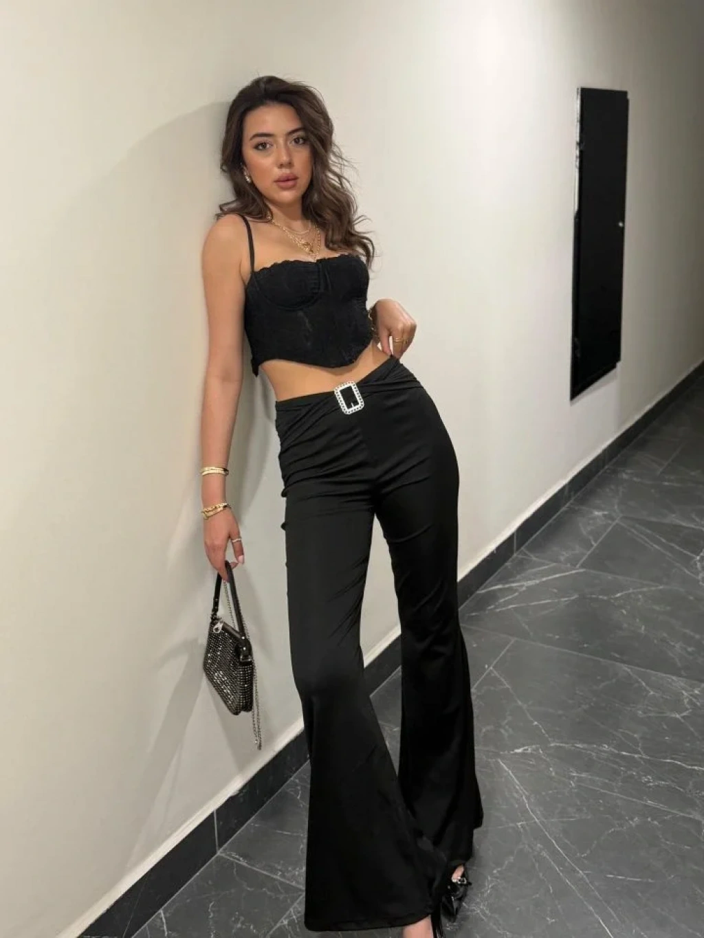 Kadın Yüksek Bel Tokalı Ispanyol Paçalı Dalgıç Pantolon