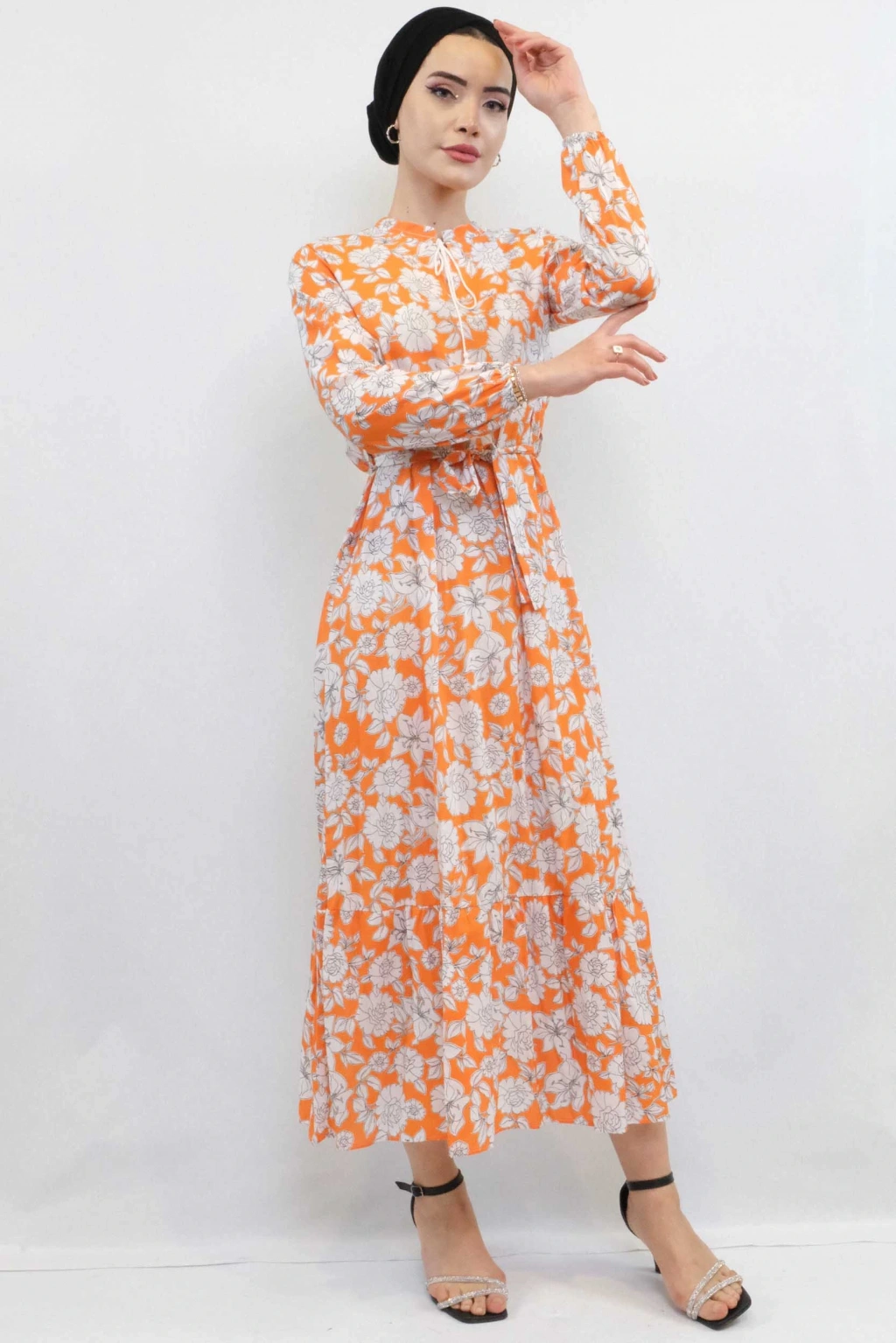 Moda Çizgi Çiçek Desenli  Pileli Elbise Turuncu