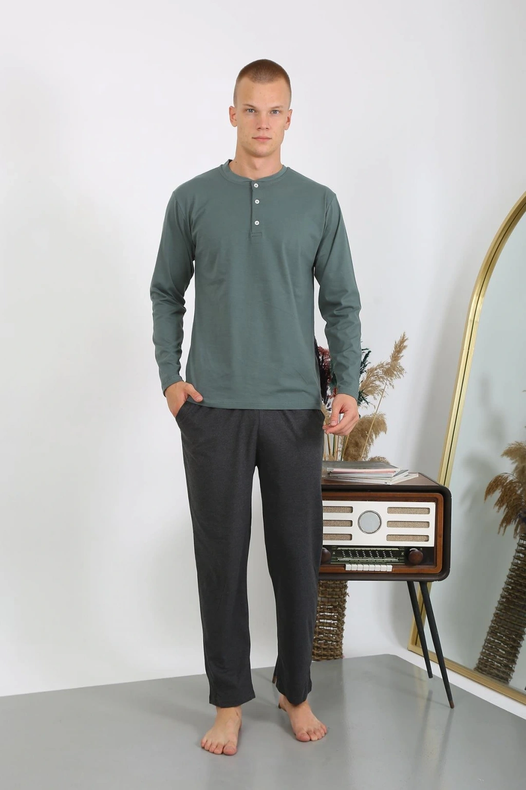 Moda Çizgi Erkek Penye Uzun Kol Pijama Takımı 6860 Haki