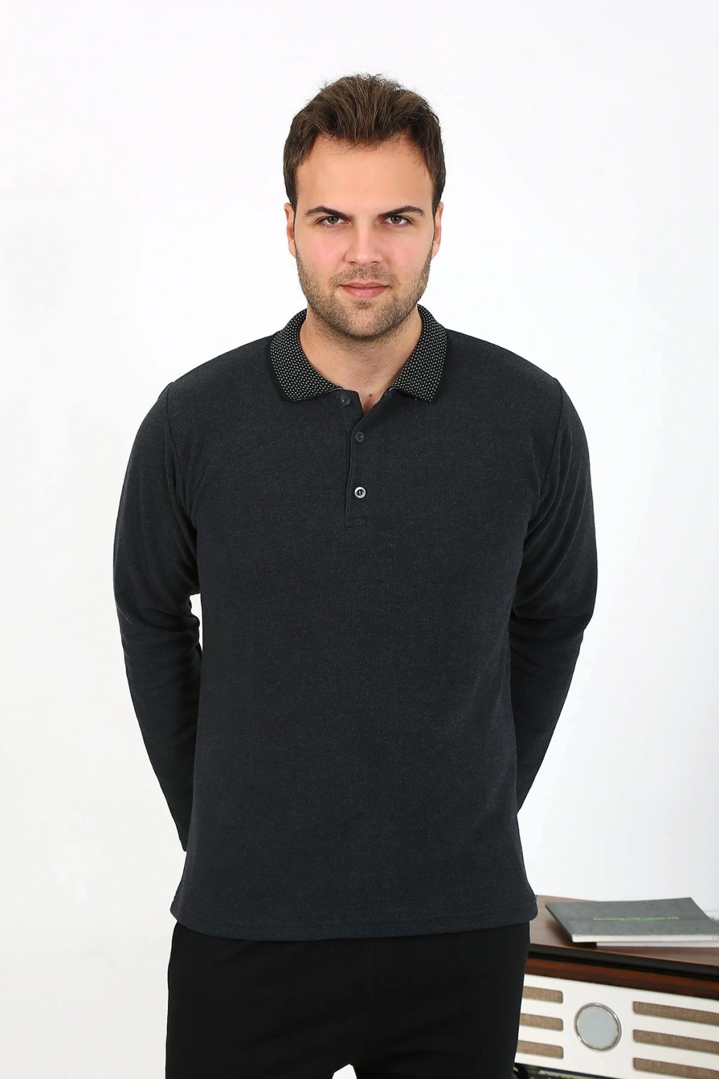 Moda Çizgi Erkek Polo Yaka Uzun Kol Penye Pijama Takımı Antrasit 6865
