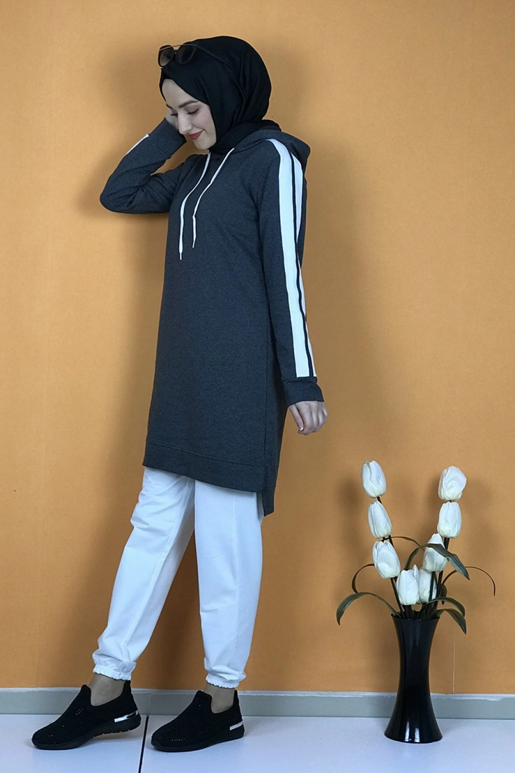 Yeni sezon tesettür moda ürünüdür.Ürünümüz iki iplik kumaştan üretilmiştir. Uzun kolludur . Ürünümüz de tek cep bulunmaktadır. .Eşofman altı paçası lastiklidir. 4 Mevsim kullanıma uygundur.