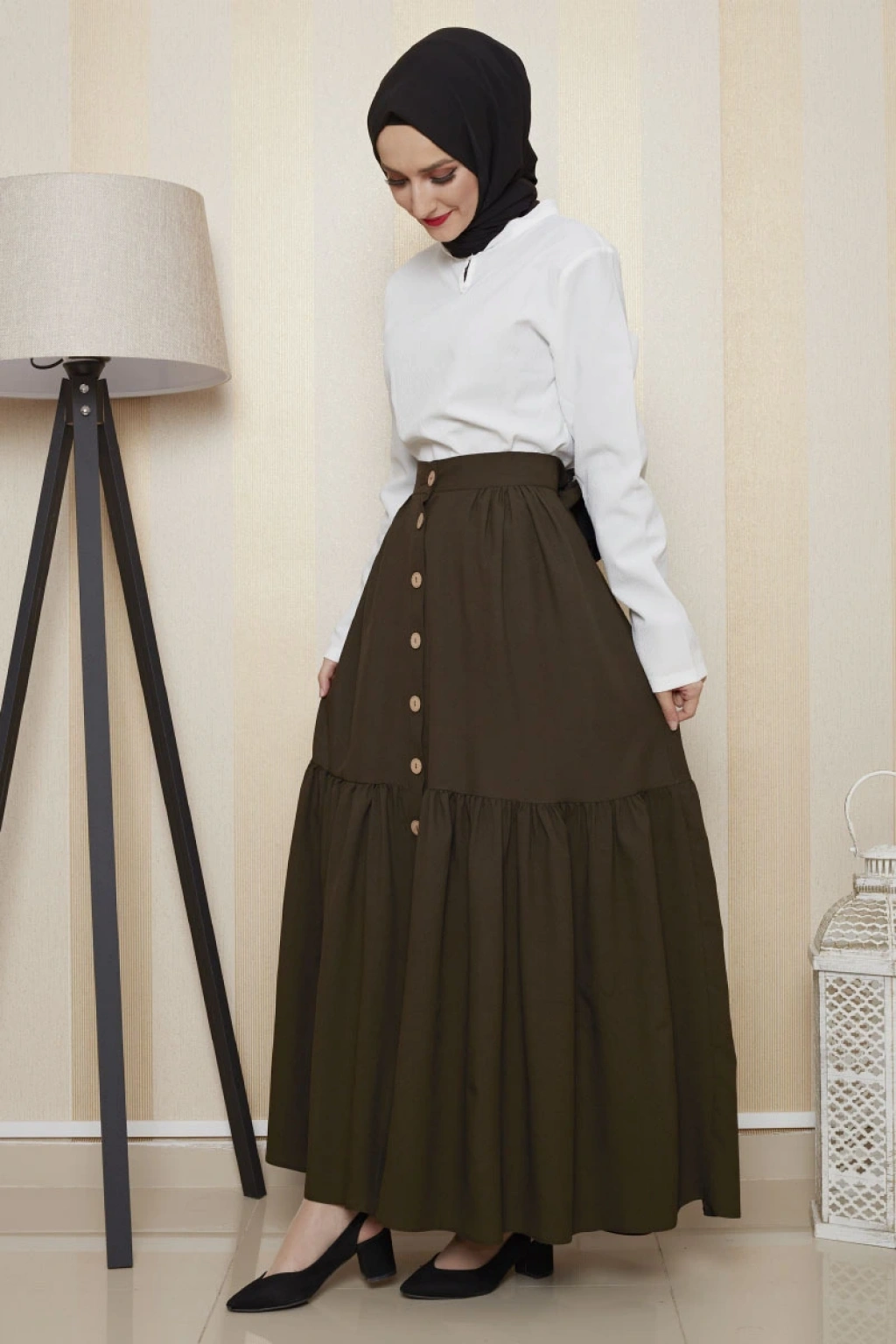 -Yeni sezon tesettür moda ürünüdür.Haki renktedir. Astarsız , Ürünümüz düğmelidir önden düğmeleri açılmaktadır rahat kullanıma sahiptir . Terletme yapmaz.