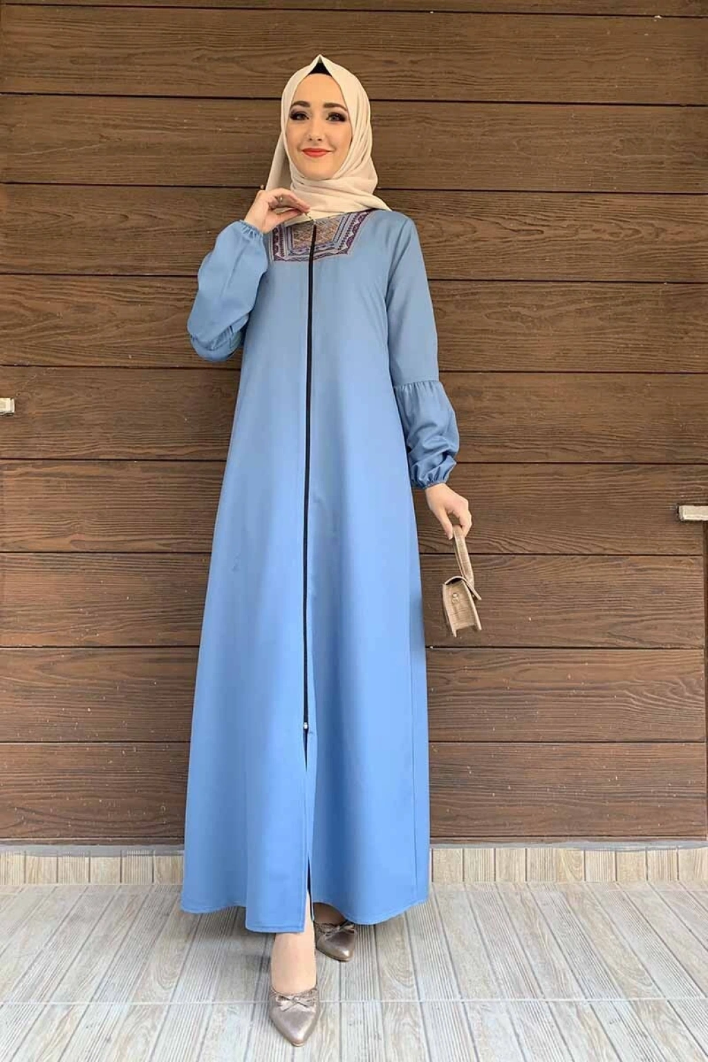 Fermuarlı Nakışlı Ferace Buz Mavisi