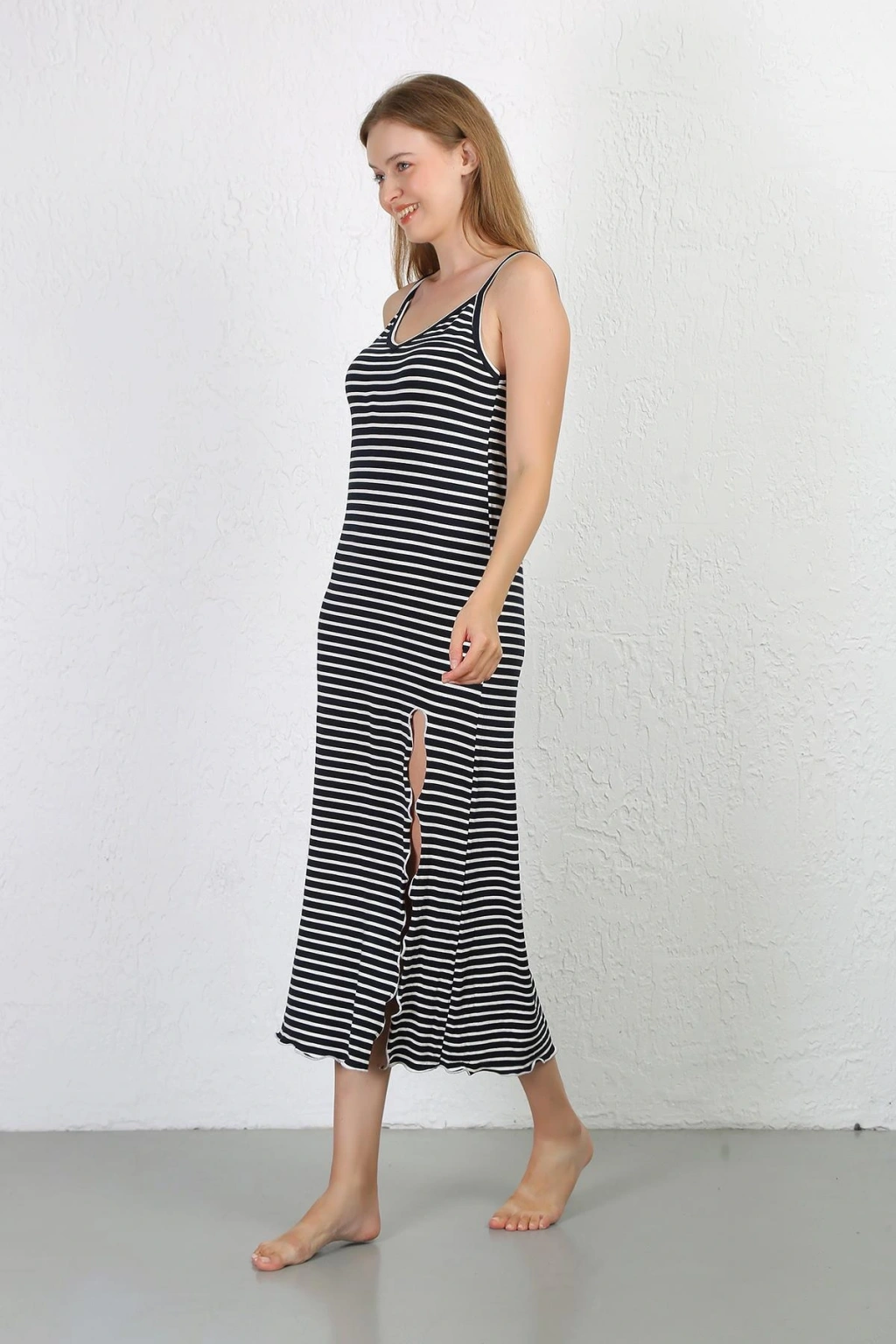 Moda Çizgi İp Askılı Penye Uzun Gecelik