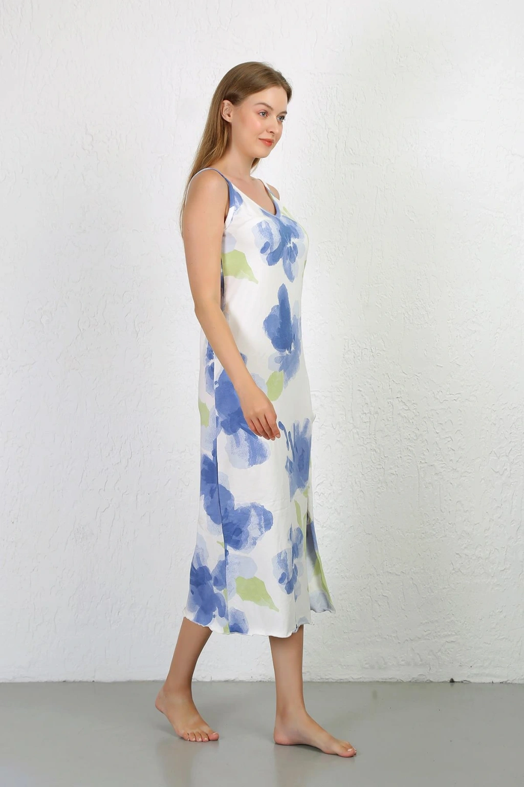 Moda Çizgi İp Askılı Uzun Yırtmaçlı Penye Gecelik 90128
