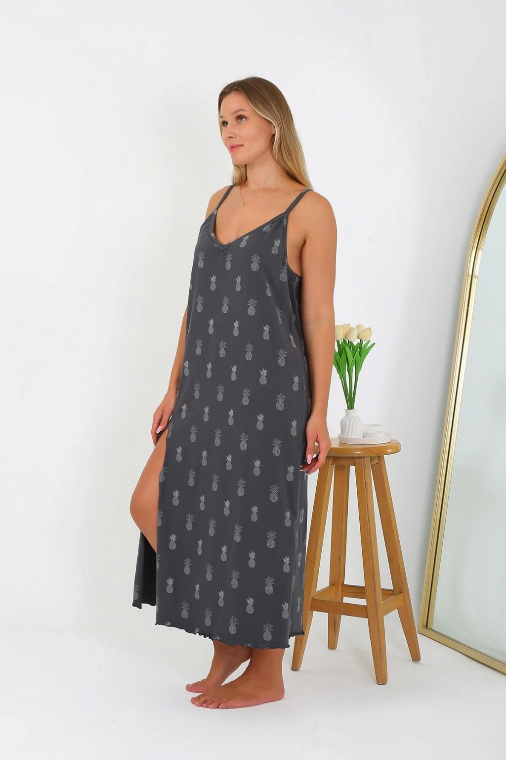 Moda Çizgi Kadın Büyük Beden İp Askılı Uzun Gecelik 12112