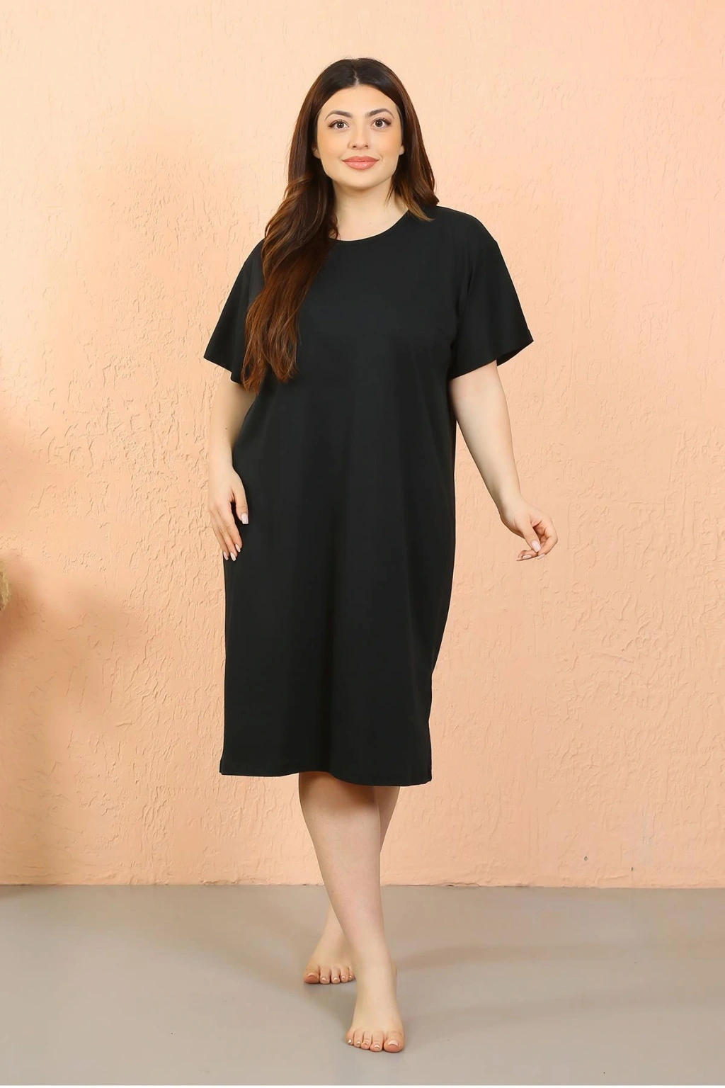 Moda Çizgi Kadın Büyük Beden Penye Kısa Kol Siyah Gecelik 12502