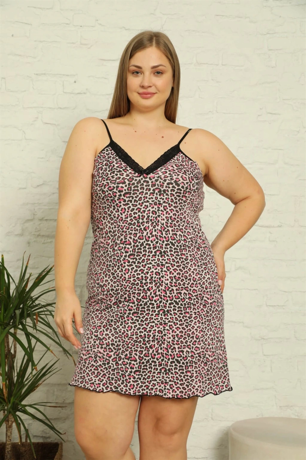 Moda Çizgi Kadın Pamuklu İp Askılı Büyük Beden Gecelik