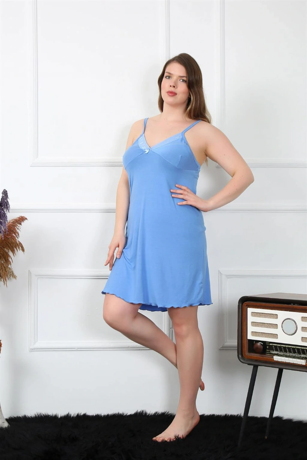 Moda Çizgi Kadın Pamuklu Mavi İp Askılı Büyük Beden Gecelik 1021