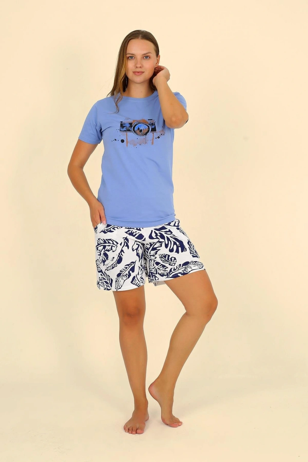 Moda Çizgi Kadın Şortlu Kısa Kol Penye Pijama Takımı Mavi 3622
