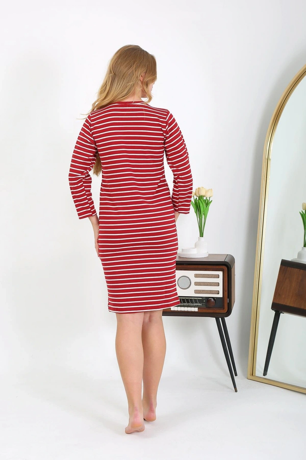 Moda Çizgi Pamuk Ev Elbisesi Tunik Gecelik Kırmızı 13132