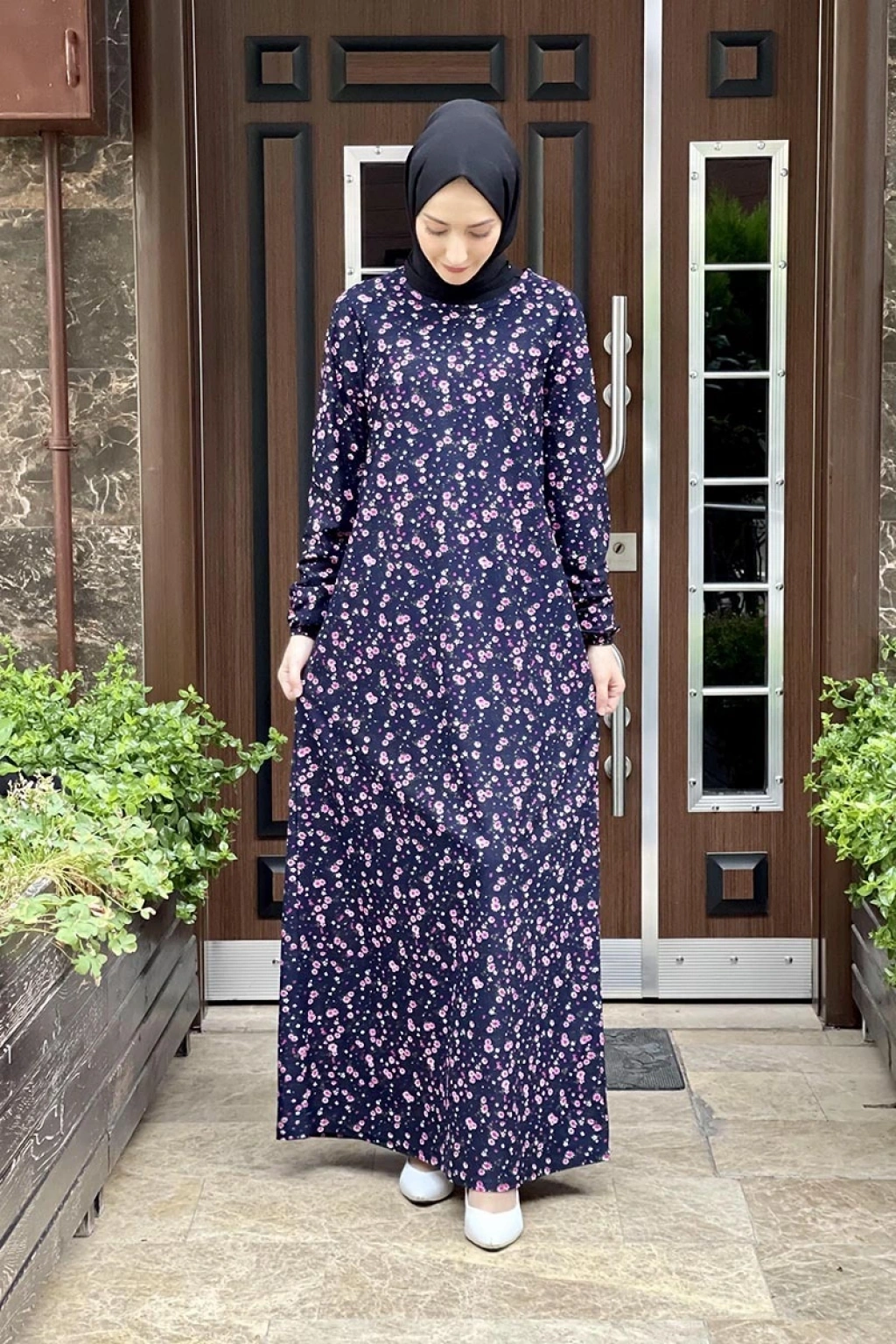 Desenli Tesettür Elbise Lacivert