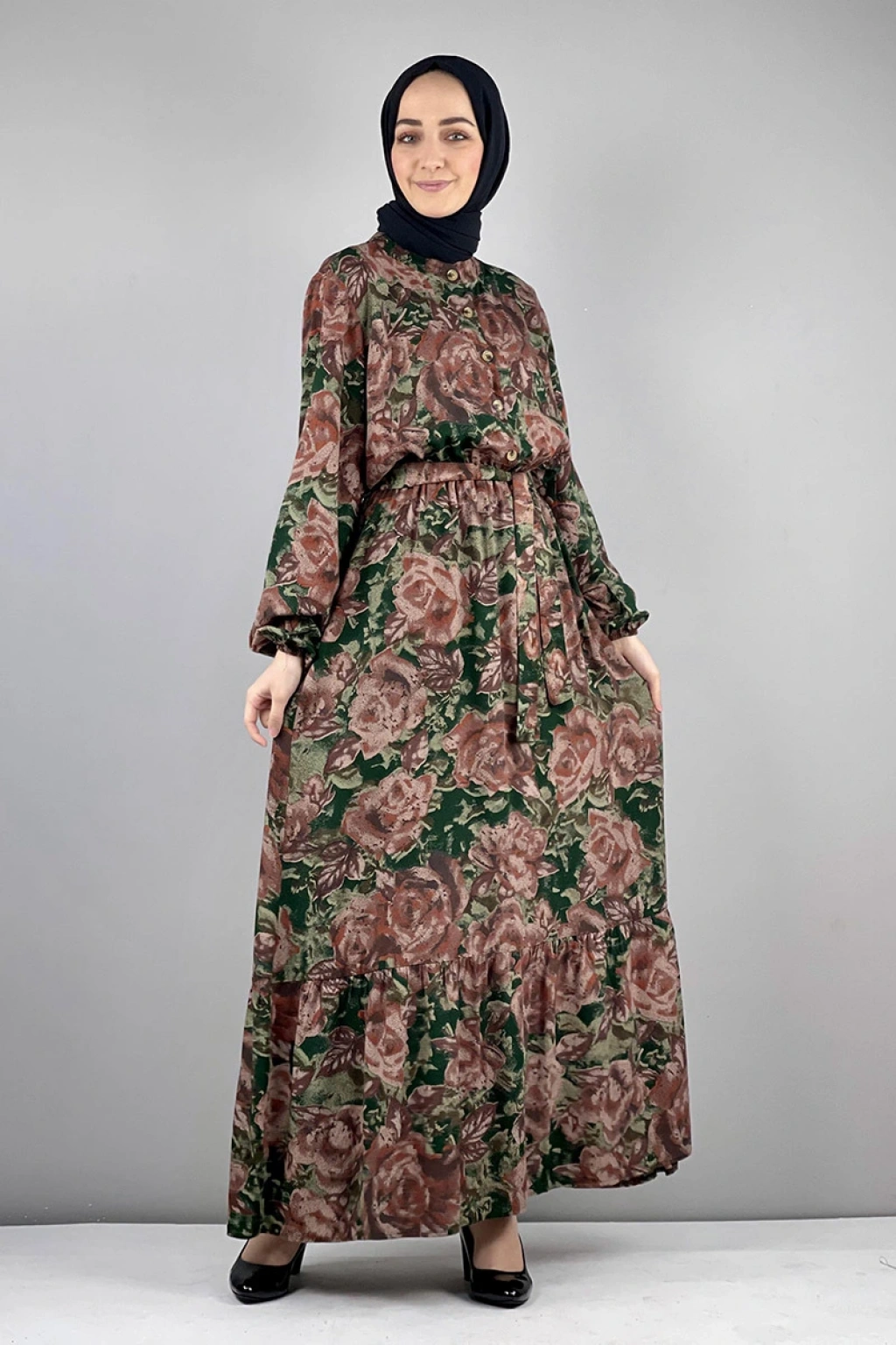 Çiçek Desenli Tesettür Elbise Zümrüt