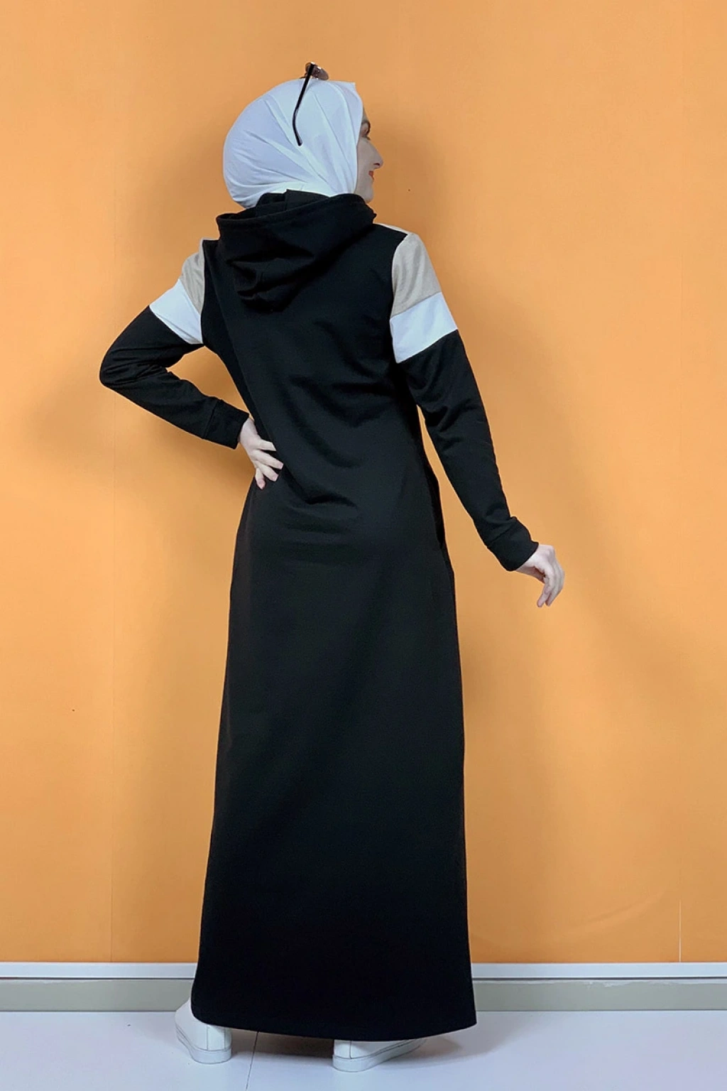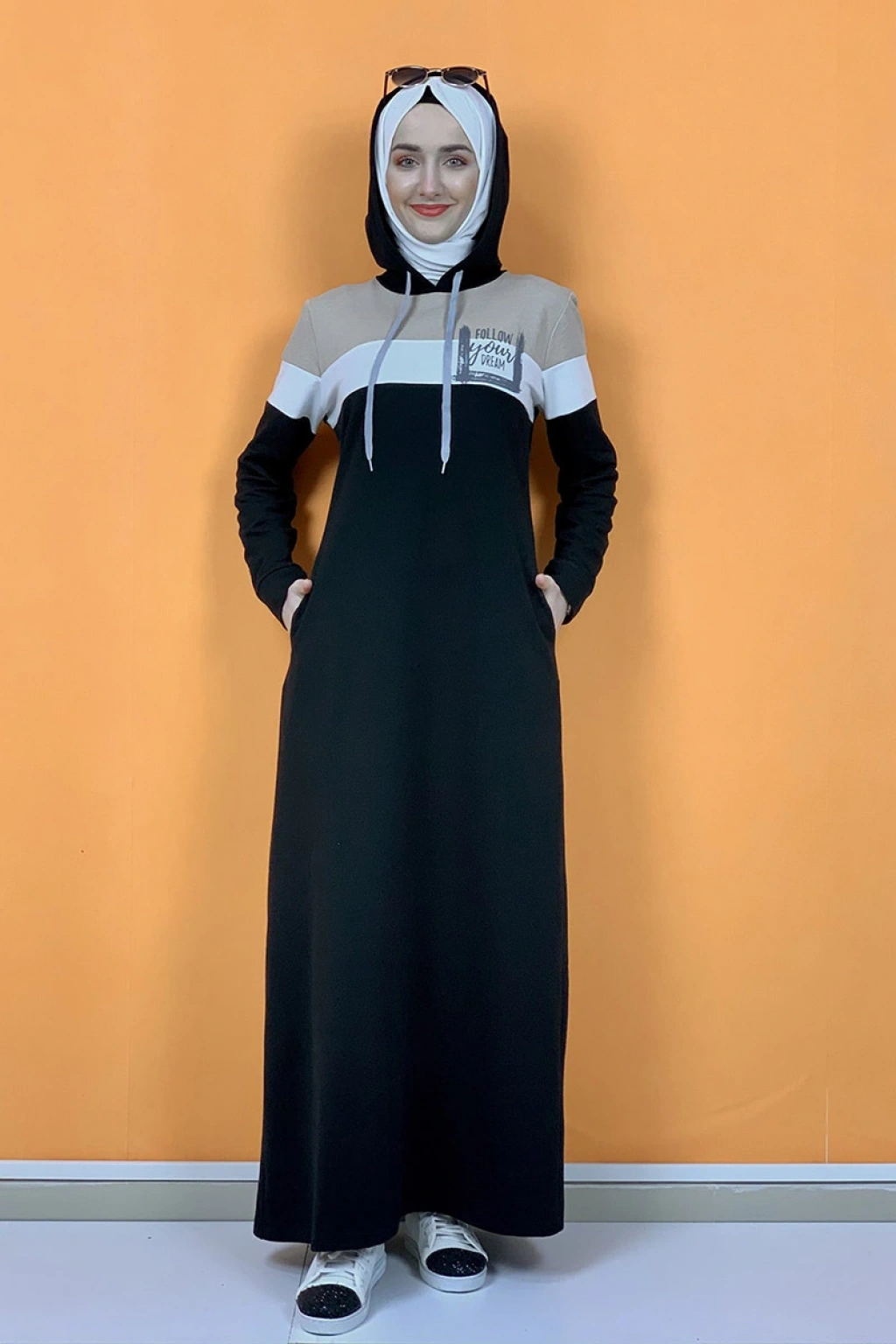 Kapşonlu Baskılı Tesettür Elbise Siyah