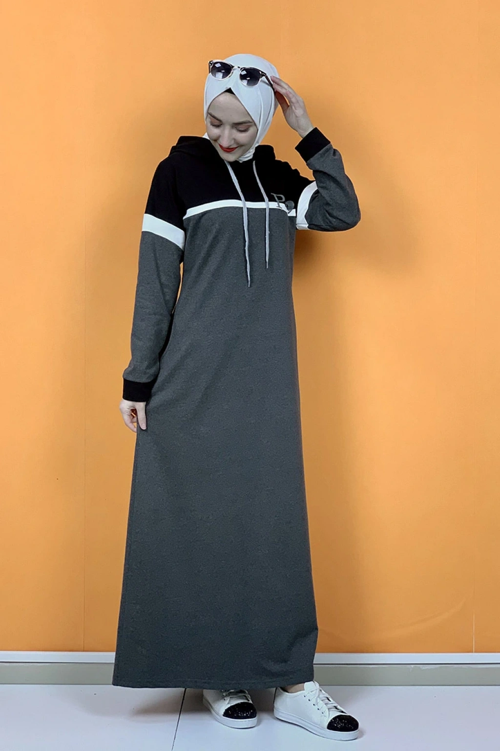 Kapşonlu Baskılı Tesettür Elbise Antrasit