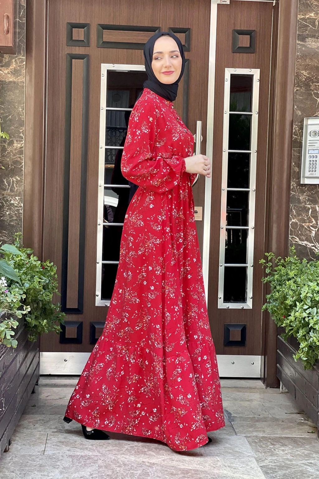 Çiçek Desenli Kemerli Elbise Nar Çiçeği