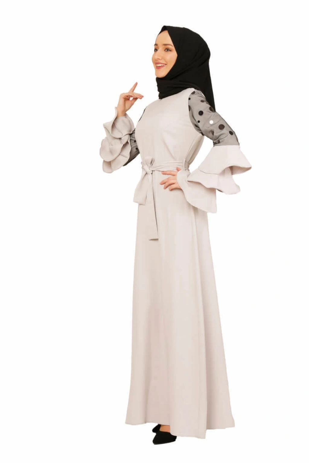 Kolları Pul Detaylı Fırfırlı Elbise Gri