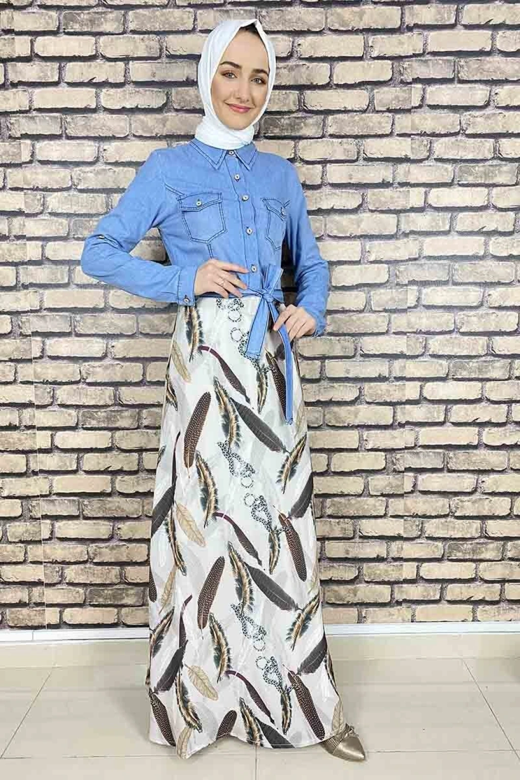 Yaprak Desenli Kot Tesettür Elbise Koyu Kahve 5033