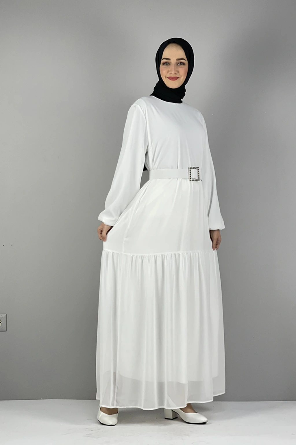 Kemerli Şifon Elbise Beyaz