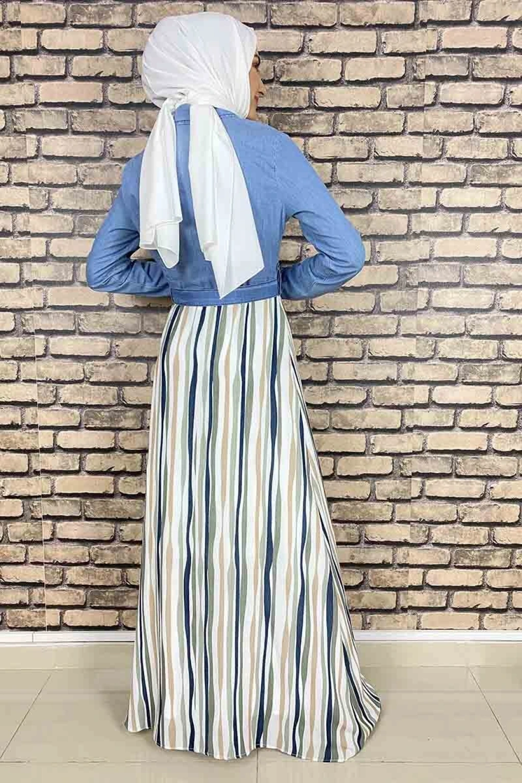 Çizgili Kot Tesettür Elbise Çağla - Beyaz