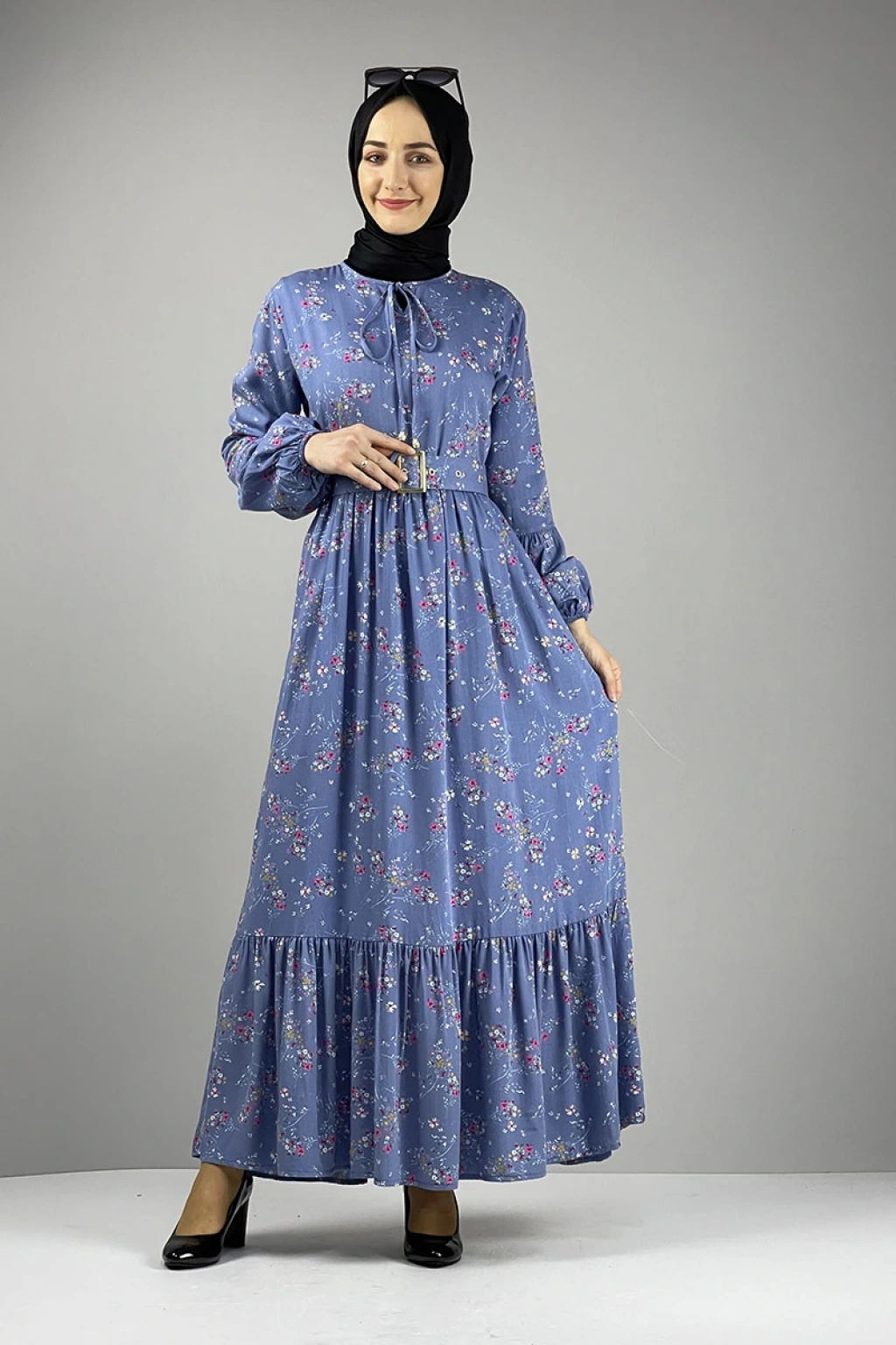 Kemer Detaylı Desenli Tesettür Elbise indigo