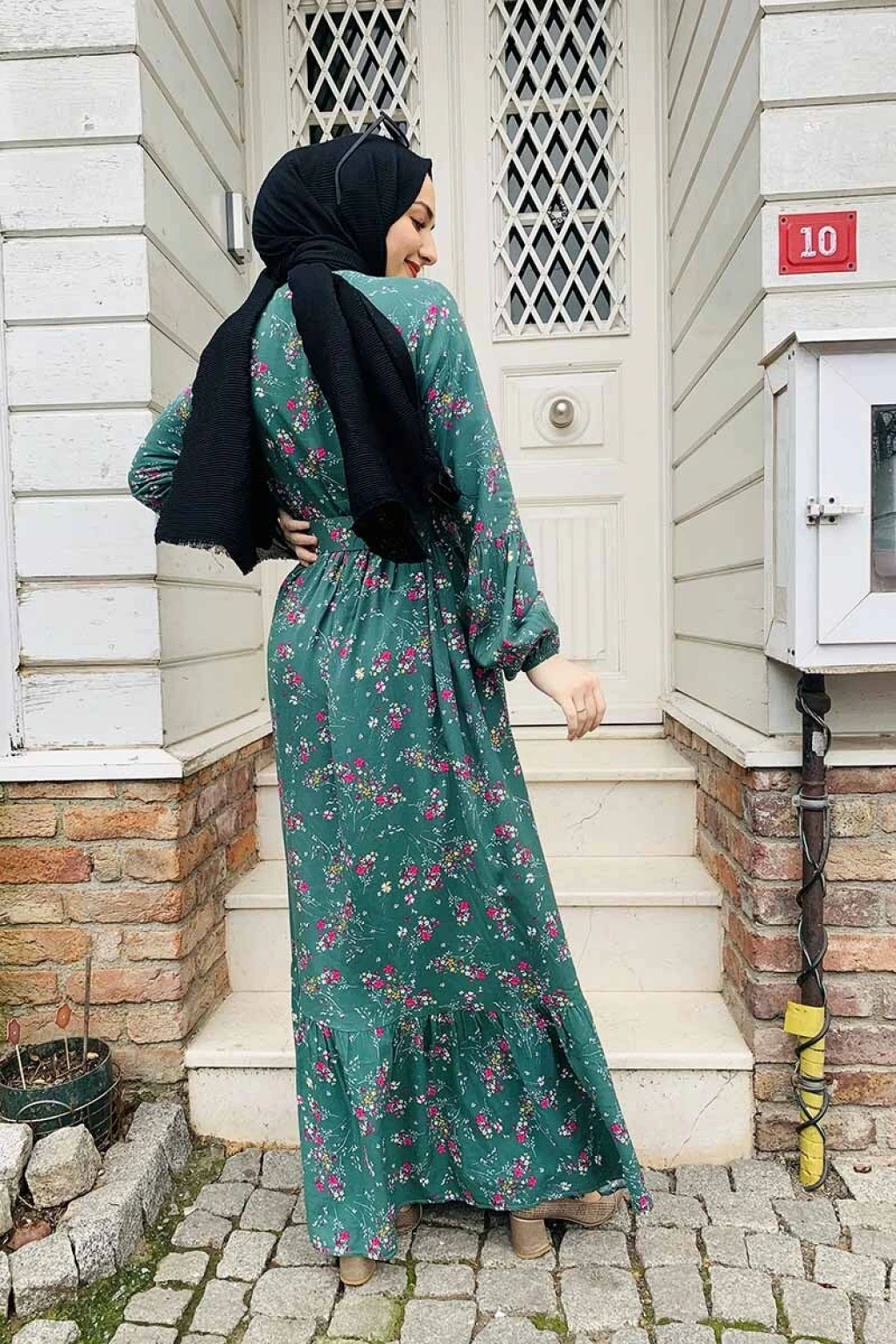 Kemer Detaylı Desenli Tesettür Elbise Yeşil