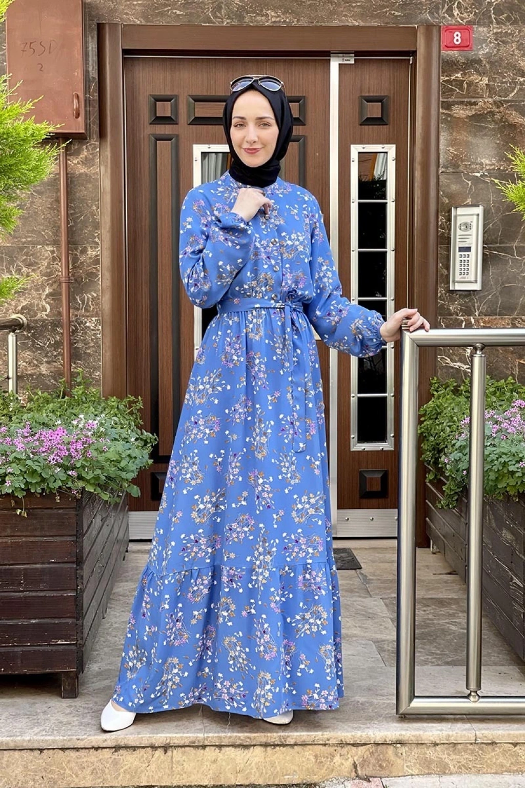 ÇİÇEK DESENLİ ELBİSE İNDİGO