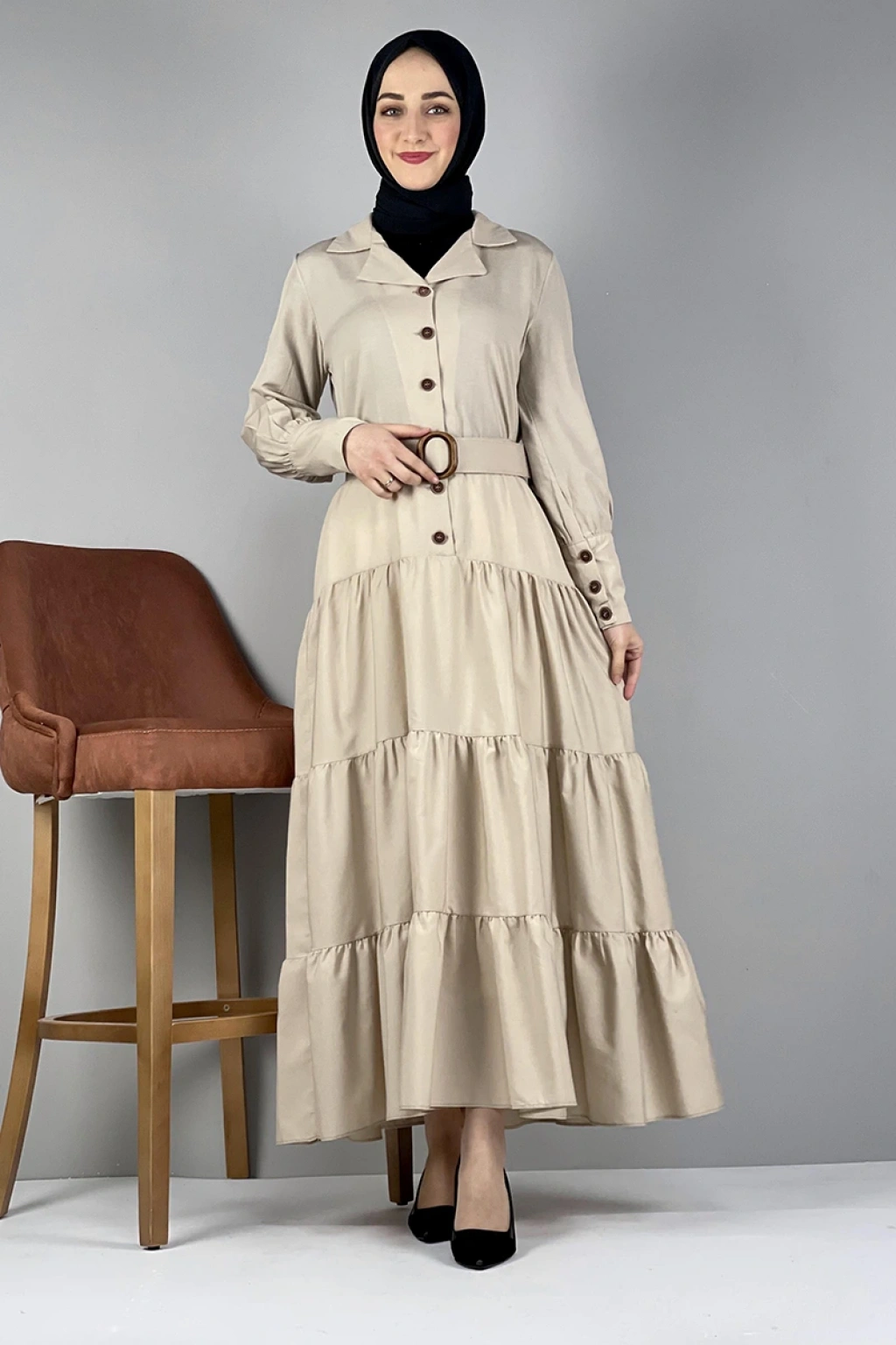 Gömlek Yaka Elbise Bej