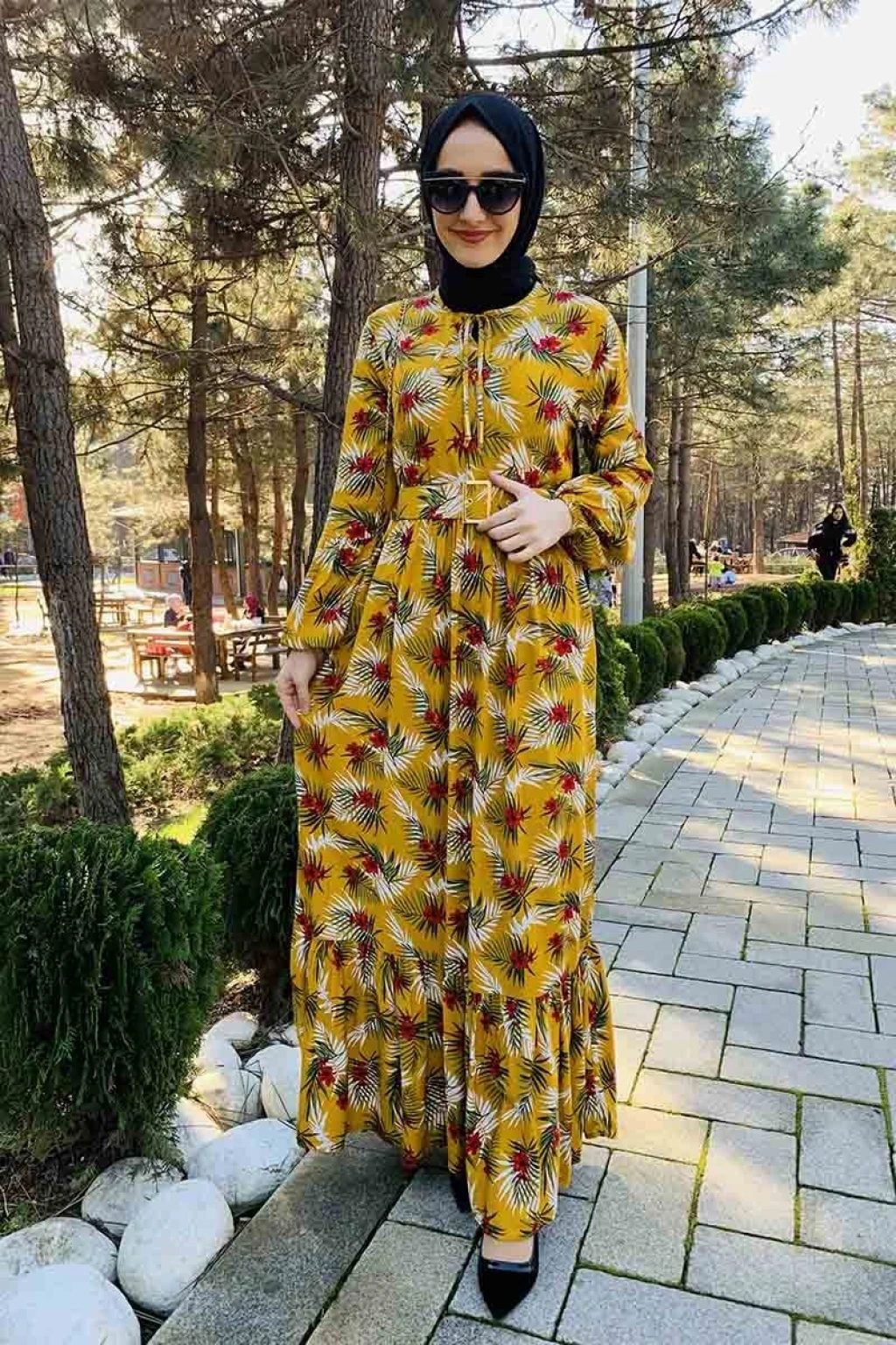 Kemer Detaylı Desenli Tesettür Elbise Hardal