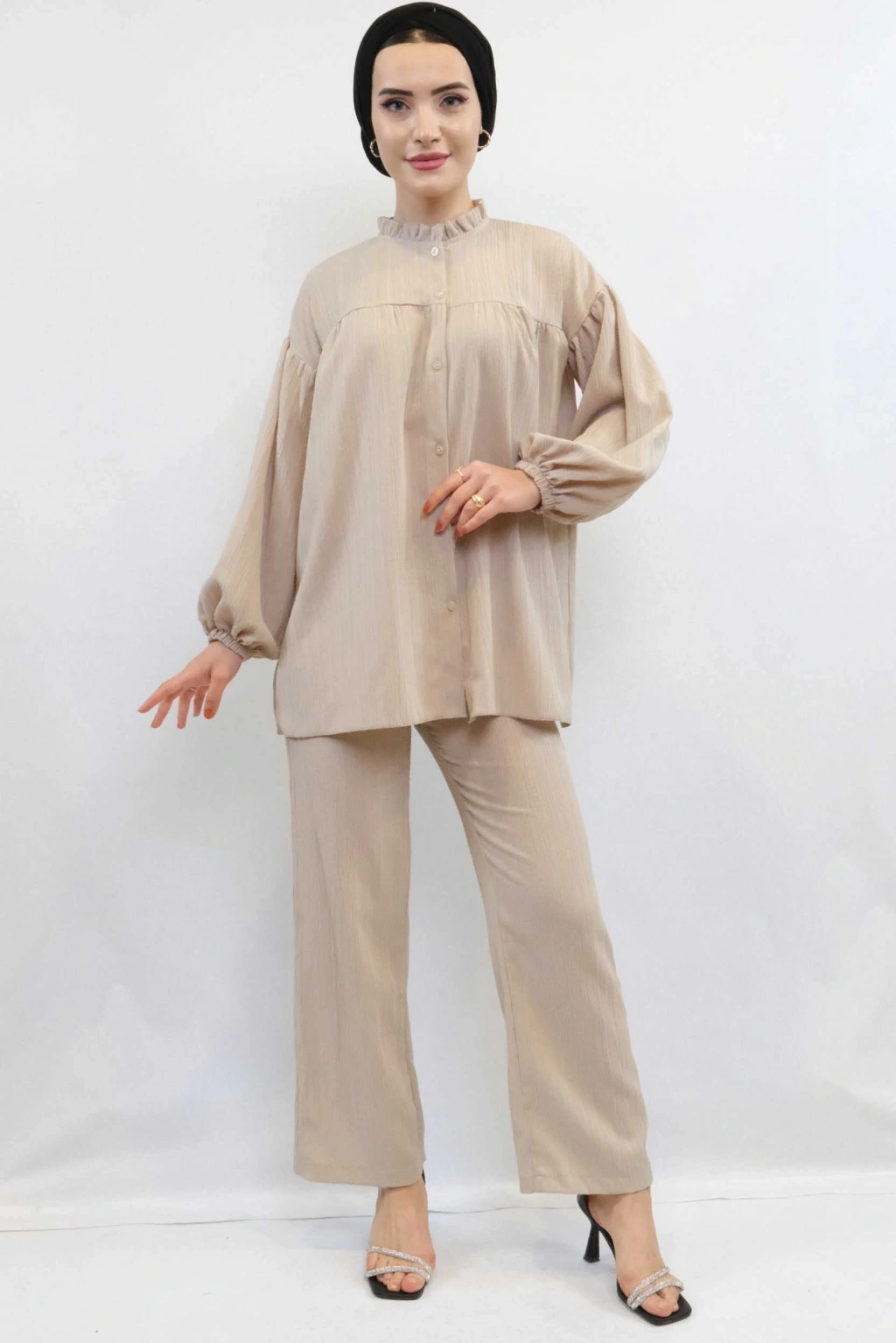 Ürün Alt Pantolon Detay : Pantolon beli lastiklidir, yüksek beldir  ve bol paça olarak tasarlanmıştır .