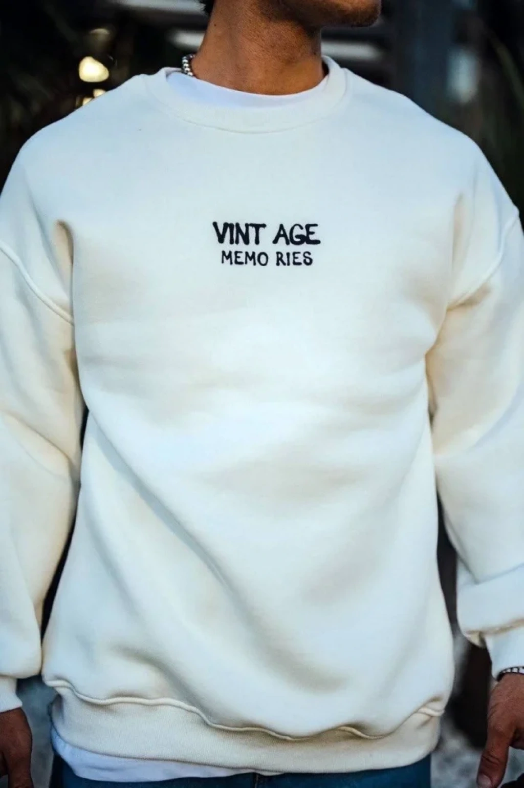 Oversize Bisiklet Yaka Üç İplik Baskılı SweatShirt - Beyaz