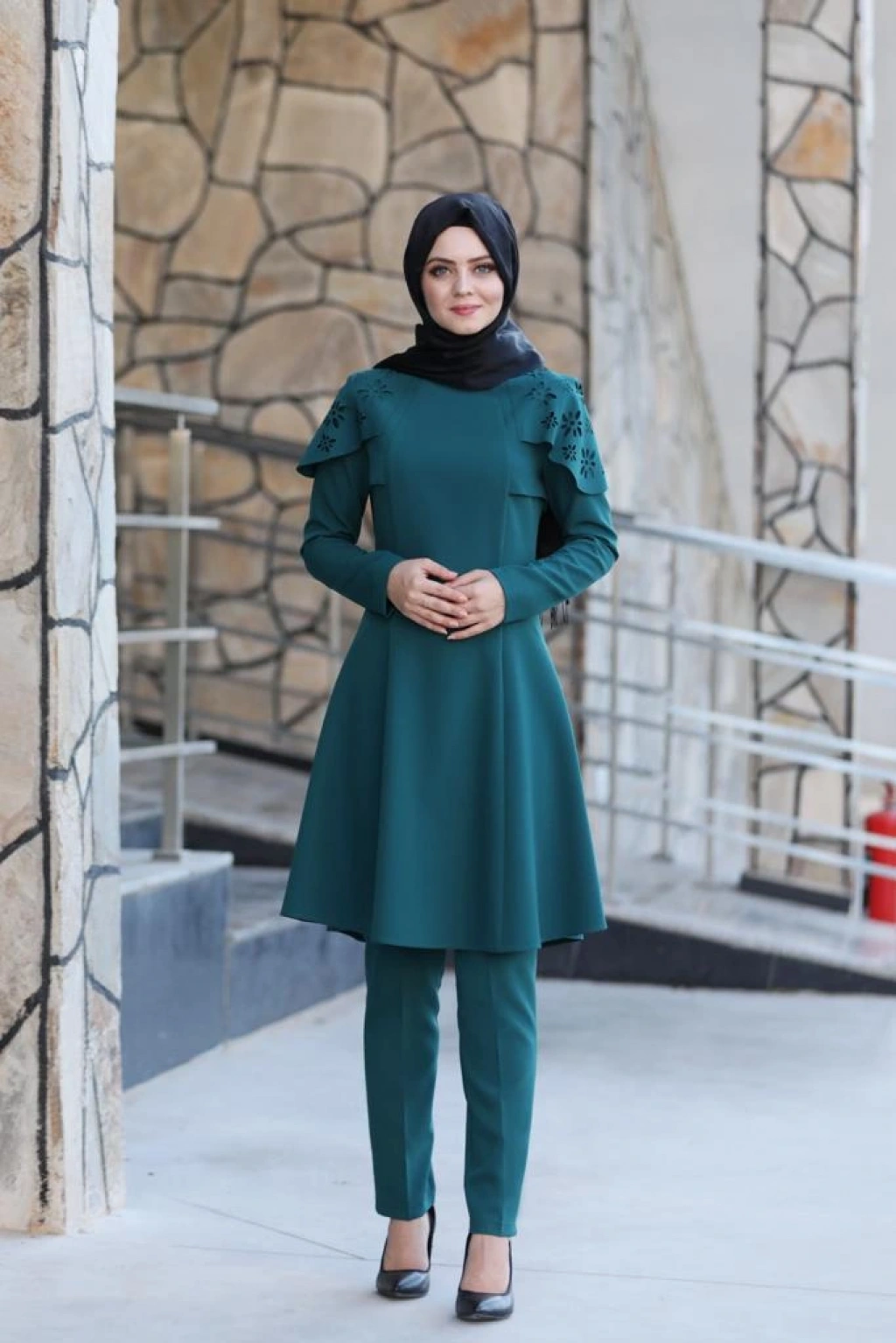 Ürün Özelliği        : Ürün yeni sezon üründür. Ürün bisiklet yakadır.Pantolon beli lastiklidir. Ürün omuz kısmınde pelerin tasarımına sahiptir. Ürün arka sırt kısmında fermuar mevcuttur. Etek kımında pile detay kullanılmıştır.