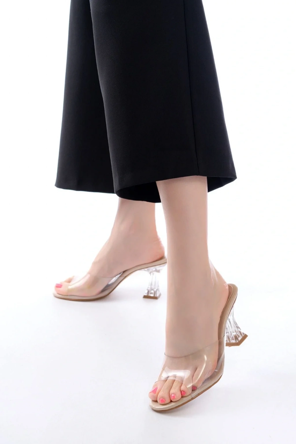 S-619 Bej Rugan Şeffaf Bantlı Şeffaf Topuklu Yuvarlak Burunlu Kadın Terlik