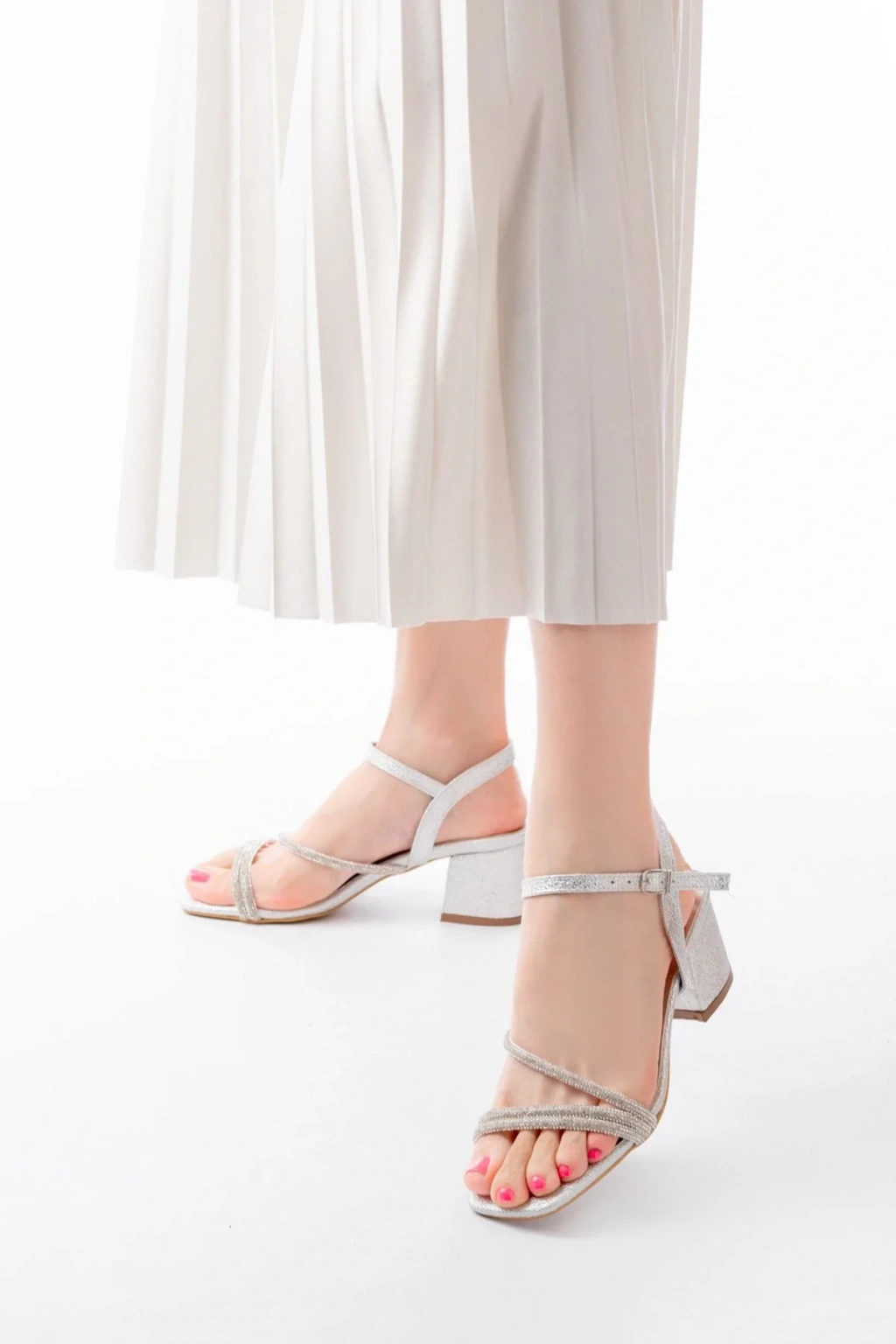 S-900 Gümüş Bantlı Taşlı Kalın Şeffaf Topuklu Kadın Ayakkabı