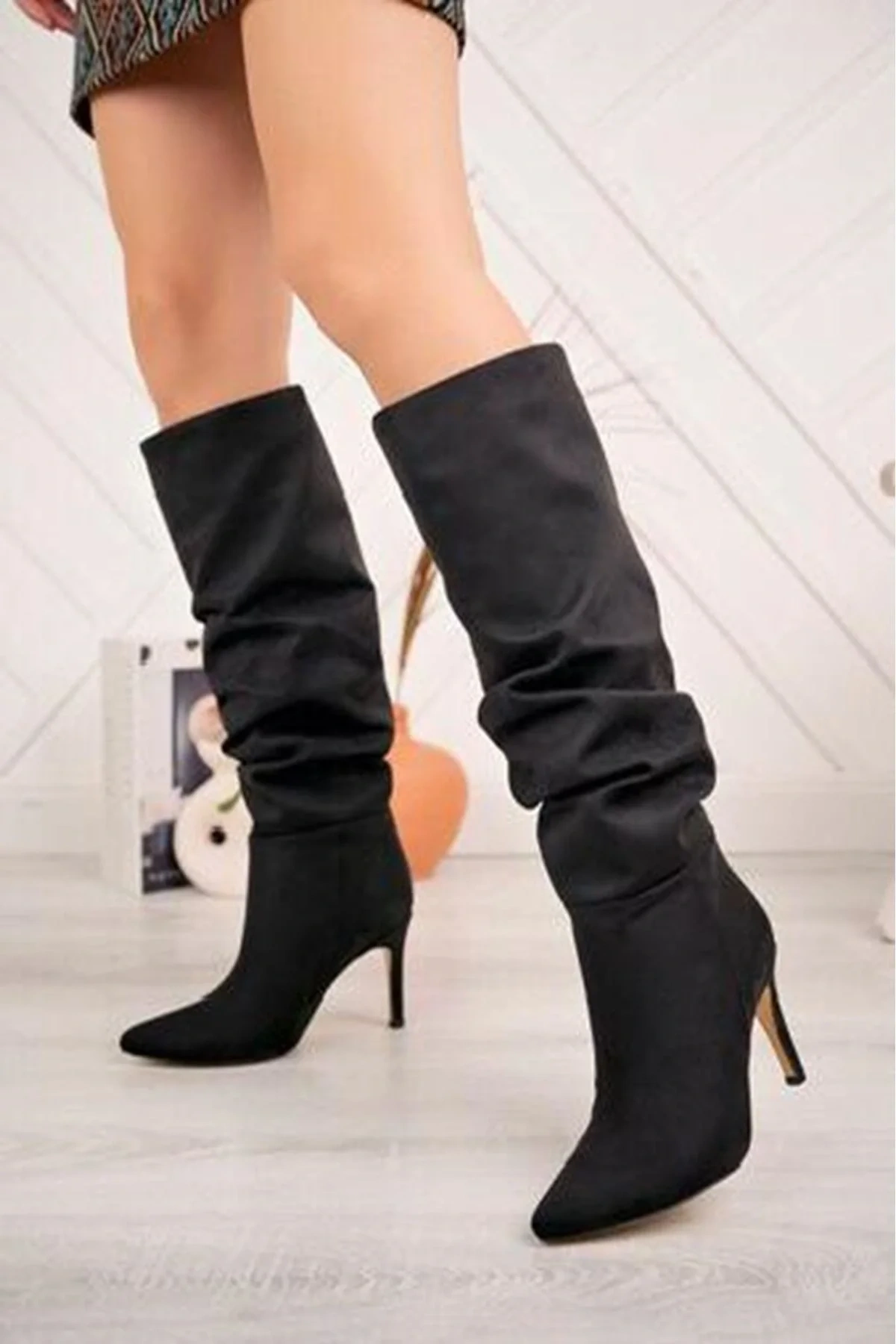 SYT-2003 Siyah Süet Körüklü İnce Topuklu Günlük Bayan Çizme